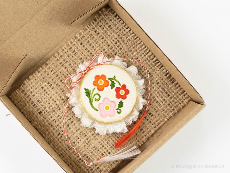 Broțișorul vine așezat cu grijă pe o bucațică de iută naturală, într-o cutie ștampilată manual cu deja bine-cunoscutul nostru mesaj “Cu primăvara în suflet și zâmbetul pe buze”, el fiind astfel gata de oferit persoanei dragi 🙂