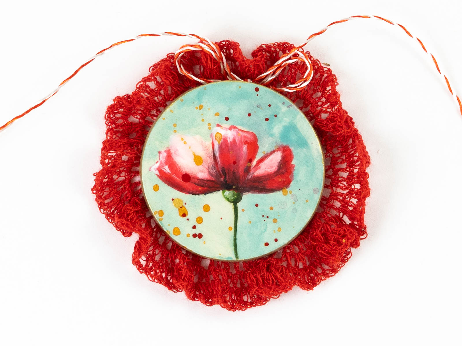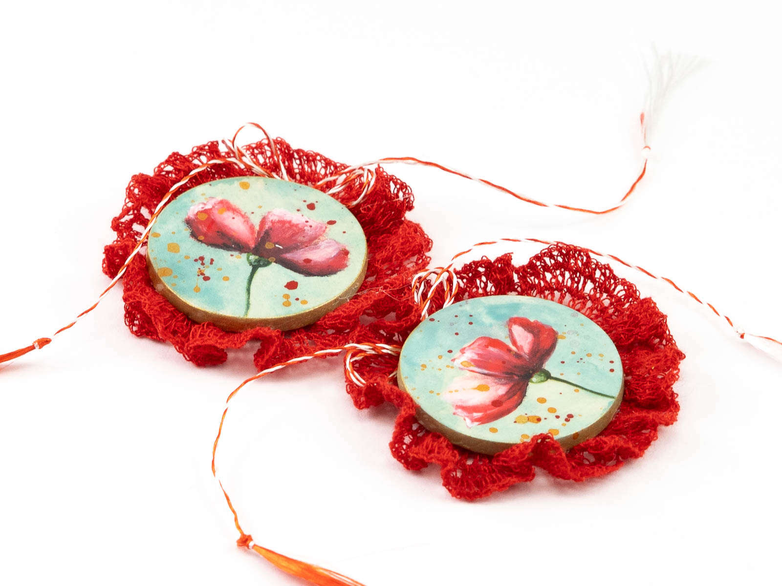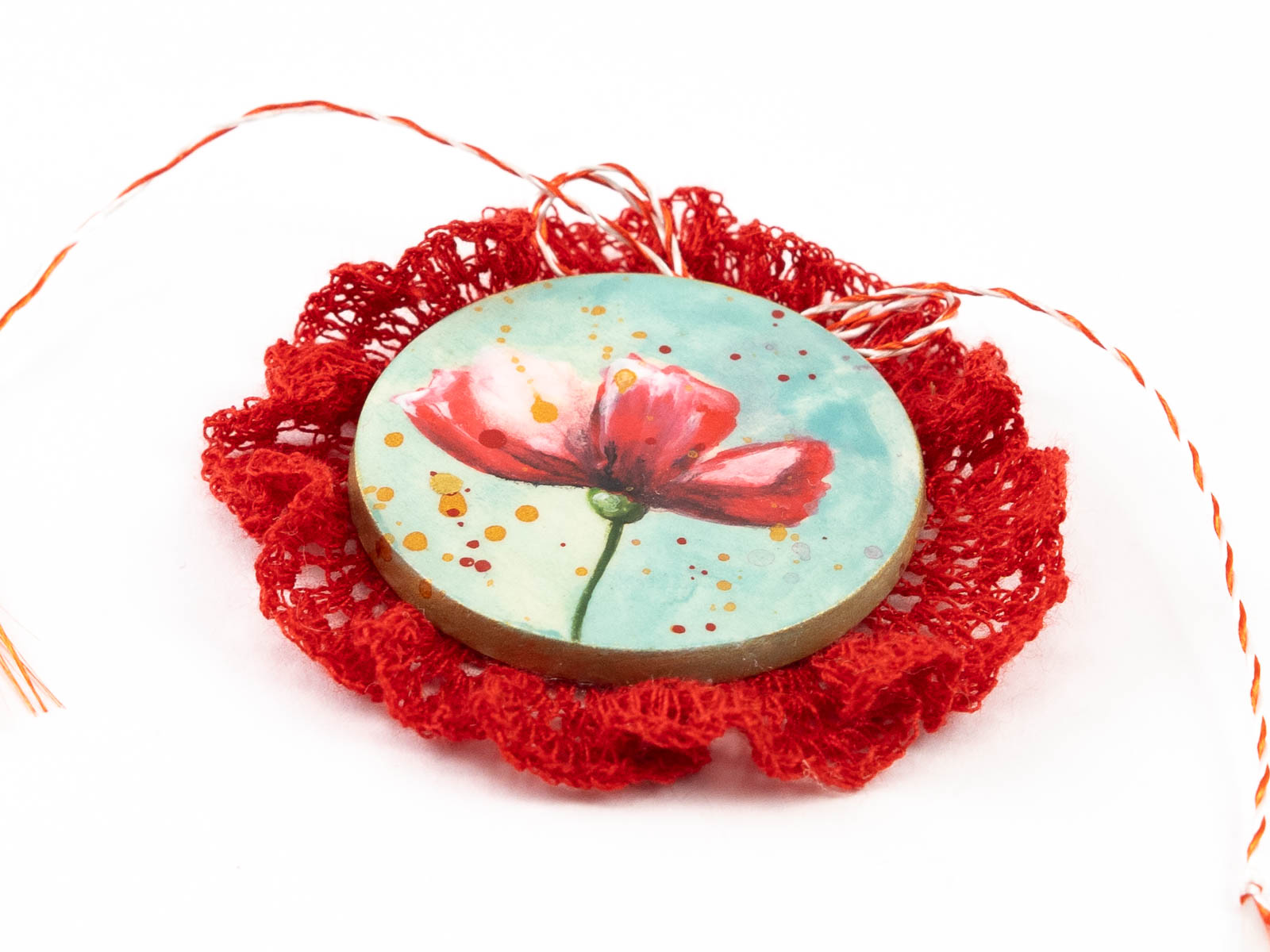 Pentru a desăvârși această broșă mărțișor, i-am adăugat o dantelă realizată în întregime manual. Ea a fost croșetată de niște degete iscusite din fire de poveste. Acul de la spate ii permite prinderea de ținutele de primăvară iar în “extrasezon” aceste mărțișoare se pot metamorfoza în broșe colorate. Astfel aceste mărțișoare broșă devin niște accesorii cochete, delicate, ușor de asortat oricărui zâmbet!