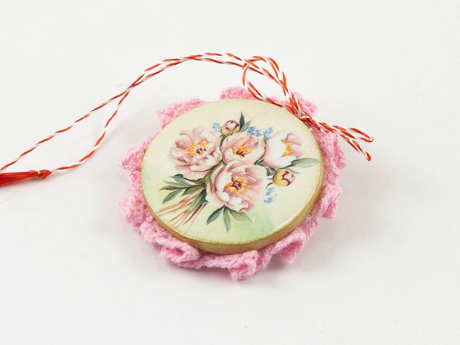 Toate aceste mărțișoare broșă sunt lucrate manual, decorate prin tehnica decoupage și împodobite de o dantelă delicată.
