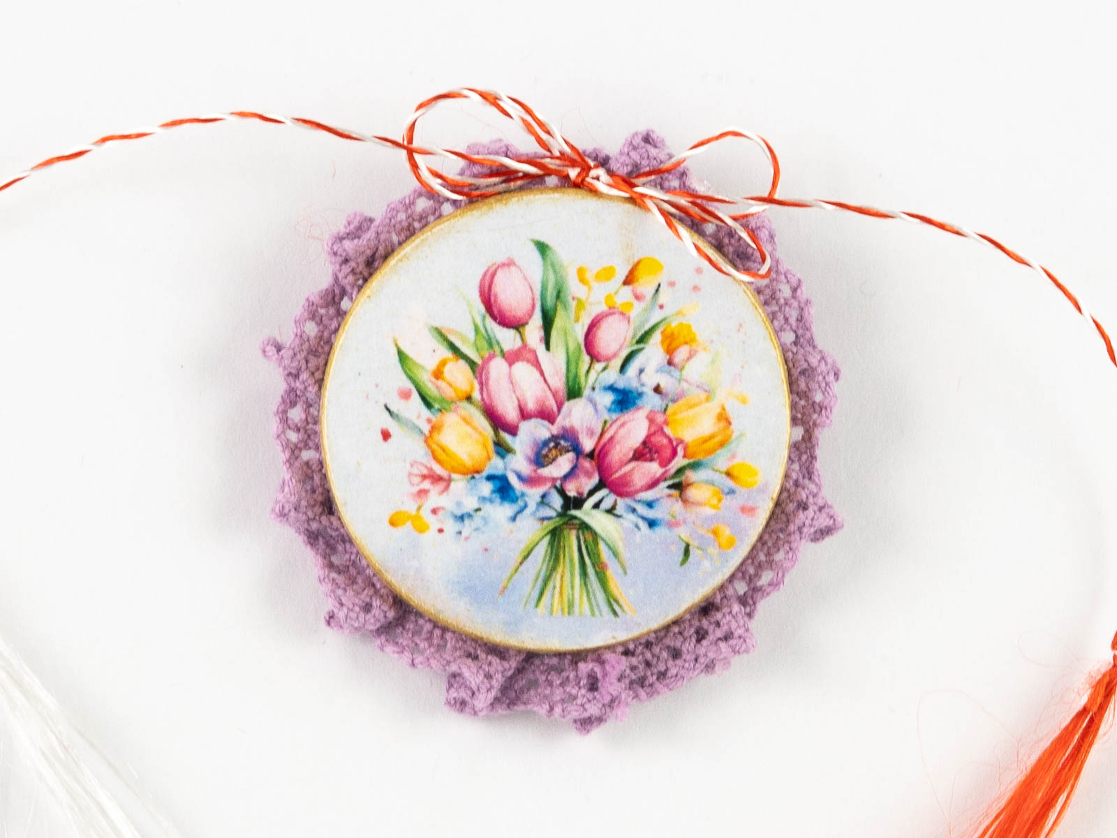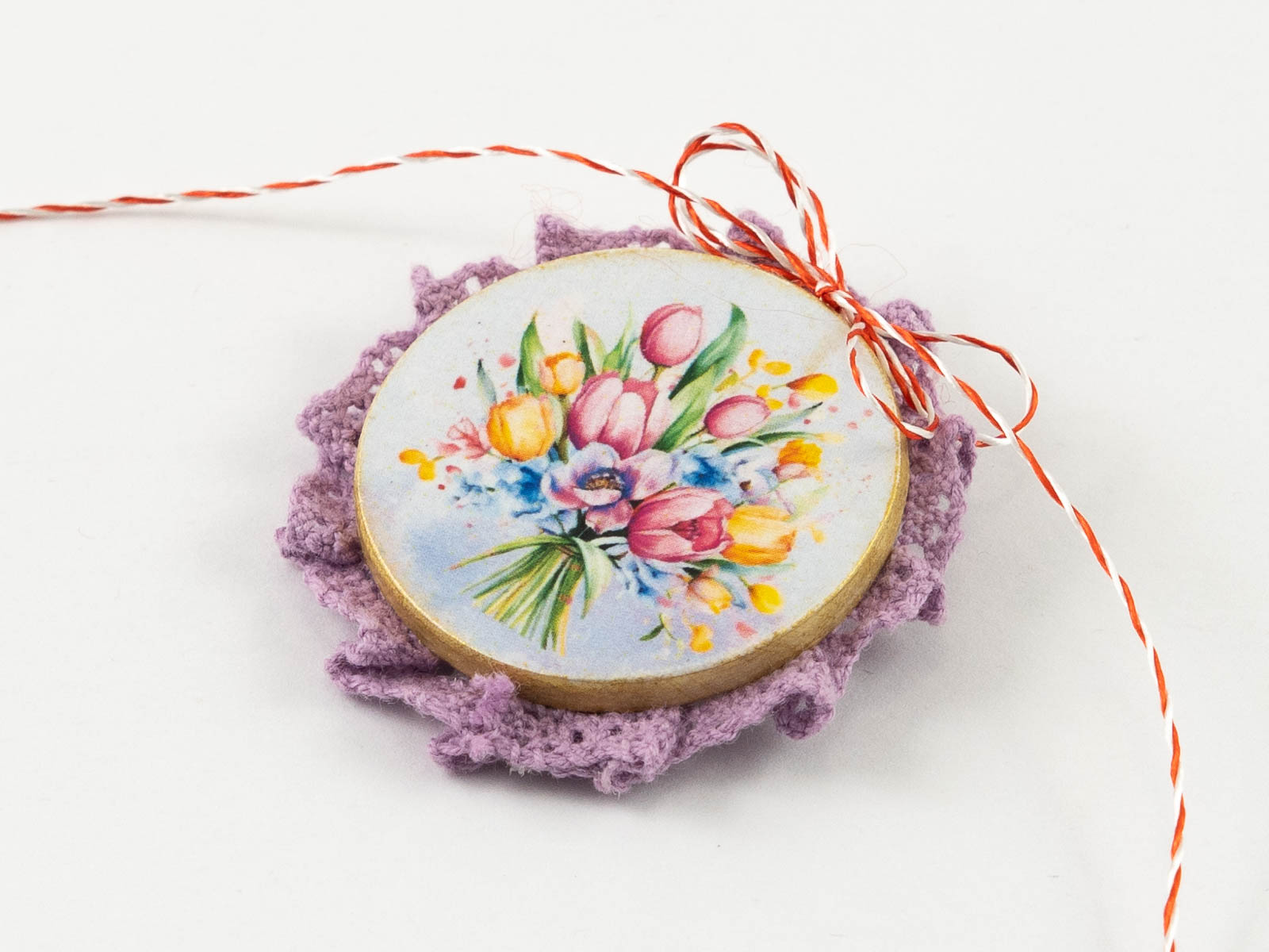 Toate aceste mărțișoare broșă sunt lucrate manual, decorate prin tehnica decoupage și împodobite de o dantelă delicată.