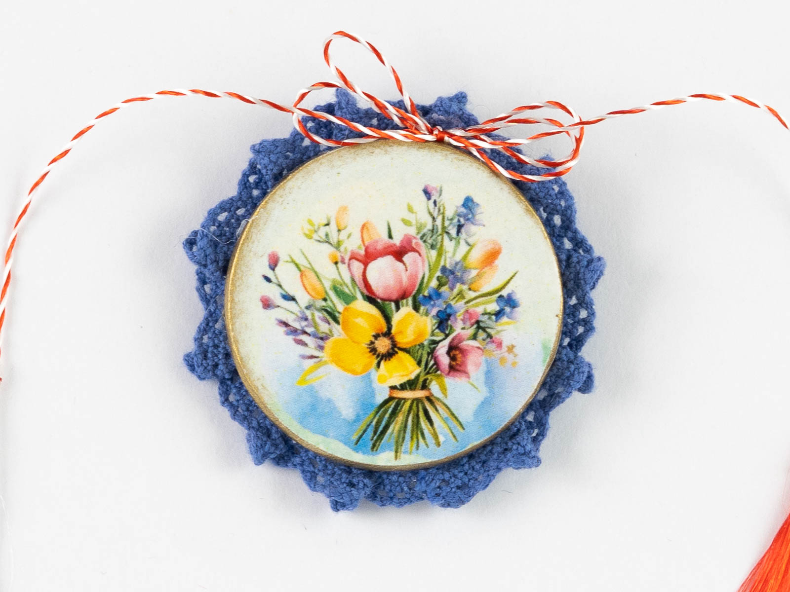 Toate aceste mărțișoare broșă sunt lucrate manual, decorate prin tehnica decoupage și împodobite de o dantelă delicată.